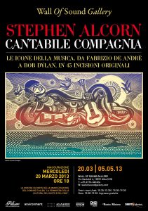 La concomitanza di una docenza di Alcorn all’Università degli Studi di Milano rende oggi finalmente possibile il vecchio sogno di portare in Italia la splendida serie di xilografie “Modern Music Masters”, arricchita per l’occasione dalle preziose tavole dedicate a De André. “Le mie immagini di Fabrizio”, racconta Alcorn, “fanno parte di una serie di ritratti di vari musicisti contemporanei che ho cominciato a creare circa due anni orsono. Dopo aver realizzato per anni ritratti di grandi figure del passato, ho provato il desiderio di rappresentare personaggi che hanno contribuito alla formazione culturale della mia epoca e della mia generazione. Mia moglie Sabina ed io ci siamo sempre considerati fortunati di essere cresciuti sotto le ali di talenti come Dylan e De André da un lato, e dei Beatles e dei Rolling Stones dall’altro. Così, mescolando ricordi e fantasia, ho dato forma concreta ad una serie di vere e proprie icone musicali. I miei ‘Modern Music Masters’ sono in costante evoluzione, anche dal punto di vista della sperimentazione nella tecnica dell’incisione linoleografica. Mi sembra particolarmente appropriato che l’infinita varietà della musica moderna trovi riscontro in una incessante sperimentazione nel modo di rappresentare gli artisti che questa tecnica consente”.